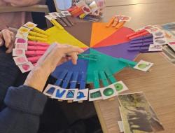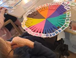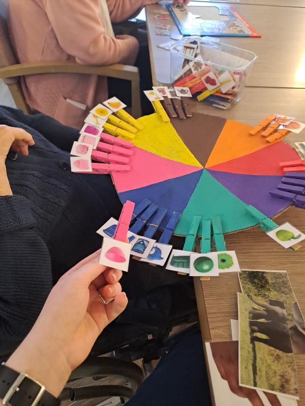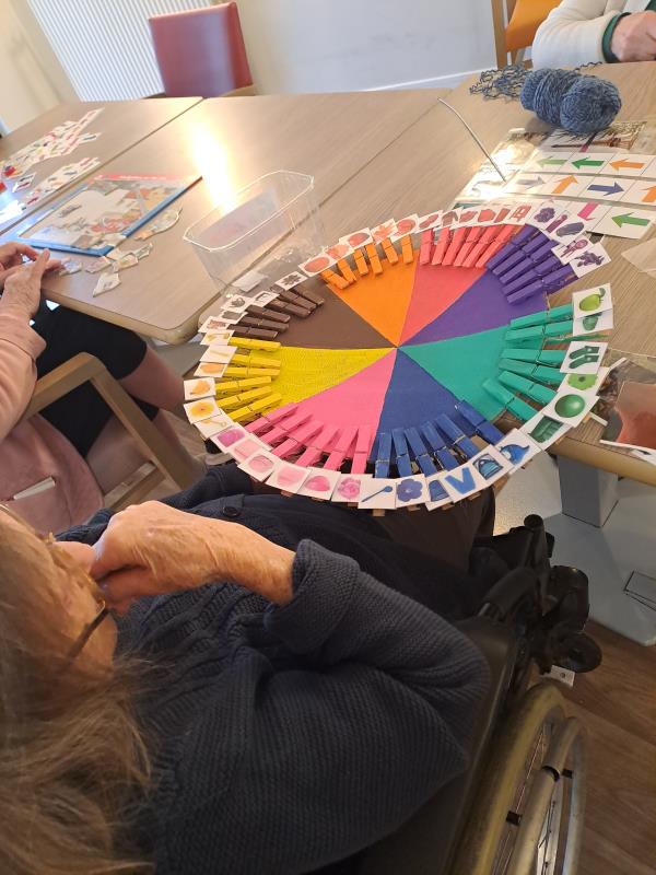 Dans le cadre des activités de stimulation proposées aux résidents, cet atelier consiste à associer des images à la couleur correspondante sur un cercle de couleur. Cette activité simple et ludique permet de proposer un temps de participation active, accessible à différents niveaux de capacités, tout en favorisant la manipulation et la réflexion.