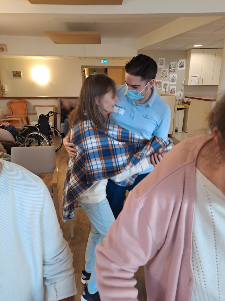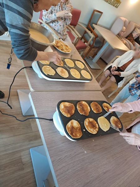 Un moment où les résidents se sentent utiles en aidant l'animatrice à faire les crêpes, pendant que d'autres écoutent la musique ou que certains dansent…