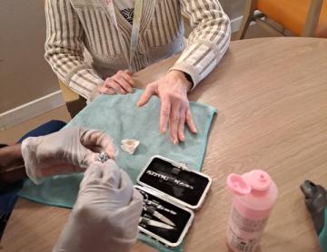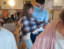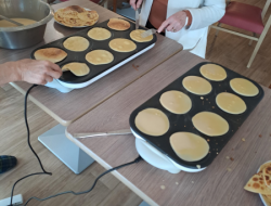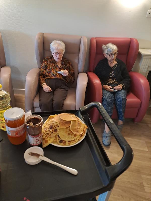 Après un travail de motricité fine, de concentration, les résidents dégustent les crêpes et aident à faire la distribution des crêpes aux résidents du rez-de-chaussée.