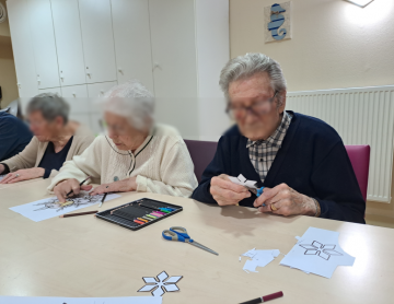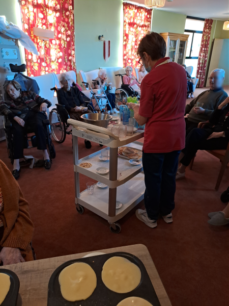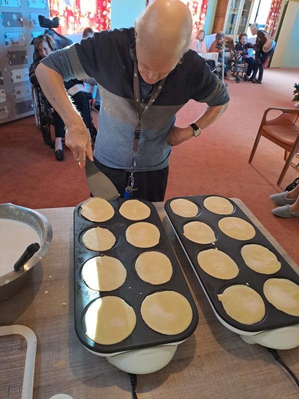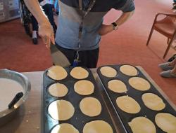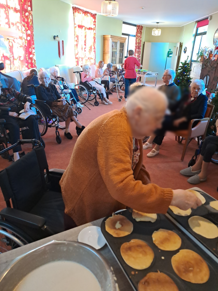 Les résidents ont mis la main à la pâte pour retourner les crêpes. Non seulement ce sont des tâches de la vie quotidienne, mais cela resserre les liens entre les résidents autour de la musique de Noël et de cette dégustation. Le reste des crêpes a fini dans les services pour les résidents qui ont souhaité rester en maisonnée ou en chambre.