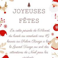 Publiée le 04/12/2025Ho ! Ho ! Ho ! Notre chalet fait son retour cette année. En cette période de l'avent, du lundi au vendredi vers 16h au salon rouge, a lieu le grand tirage au sort des petites attentions réservées aux résidents. Aujourd'hui, jeudi 4 décembre, 16 résidents ont été tirés [...] Lire la suite