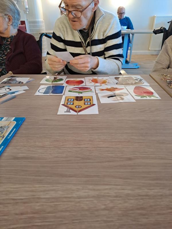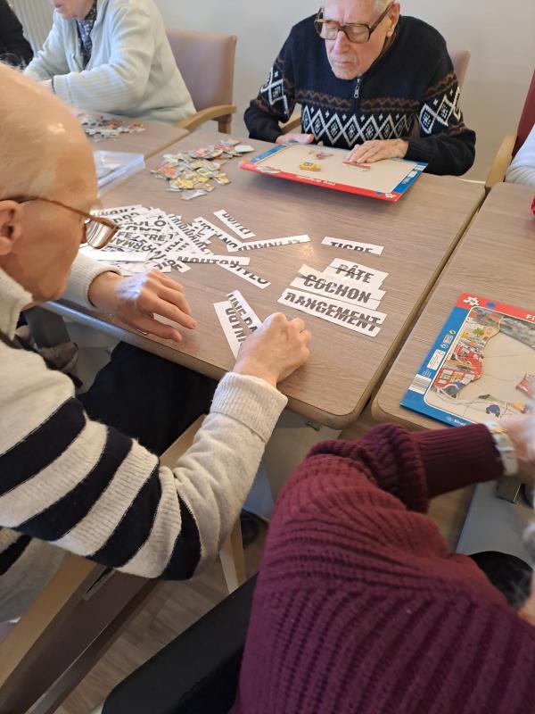 Dans le cadre des activités, un atelier de stimulation cognitive a été proposé à des résidents autour de puzzles d’images et de jeux de mots. Les participants ont été amenés à reconstituer des images familières et à associer la partie haute et la partie basse d'un mot.